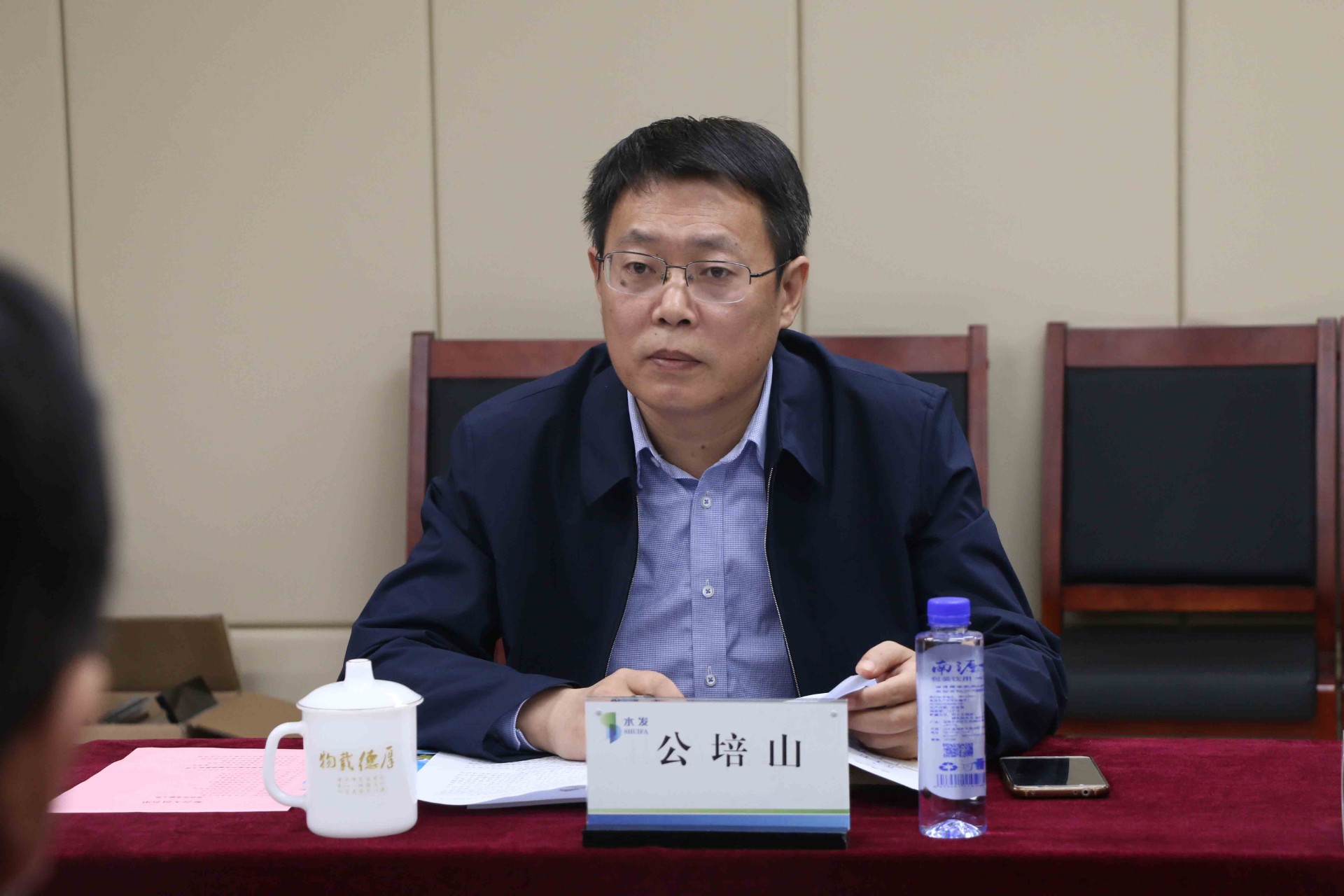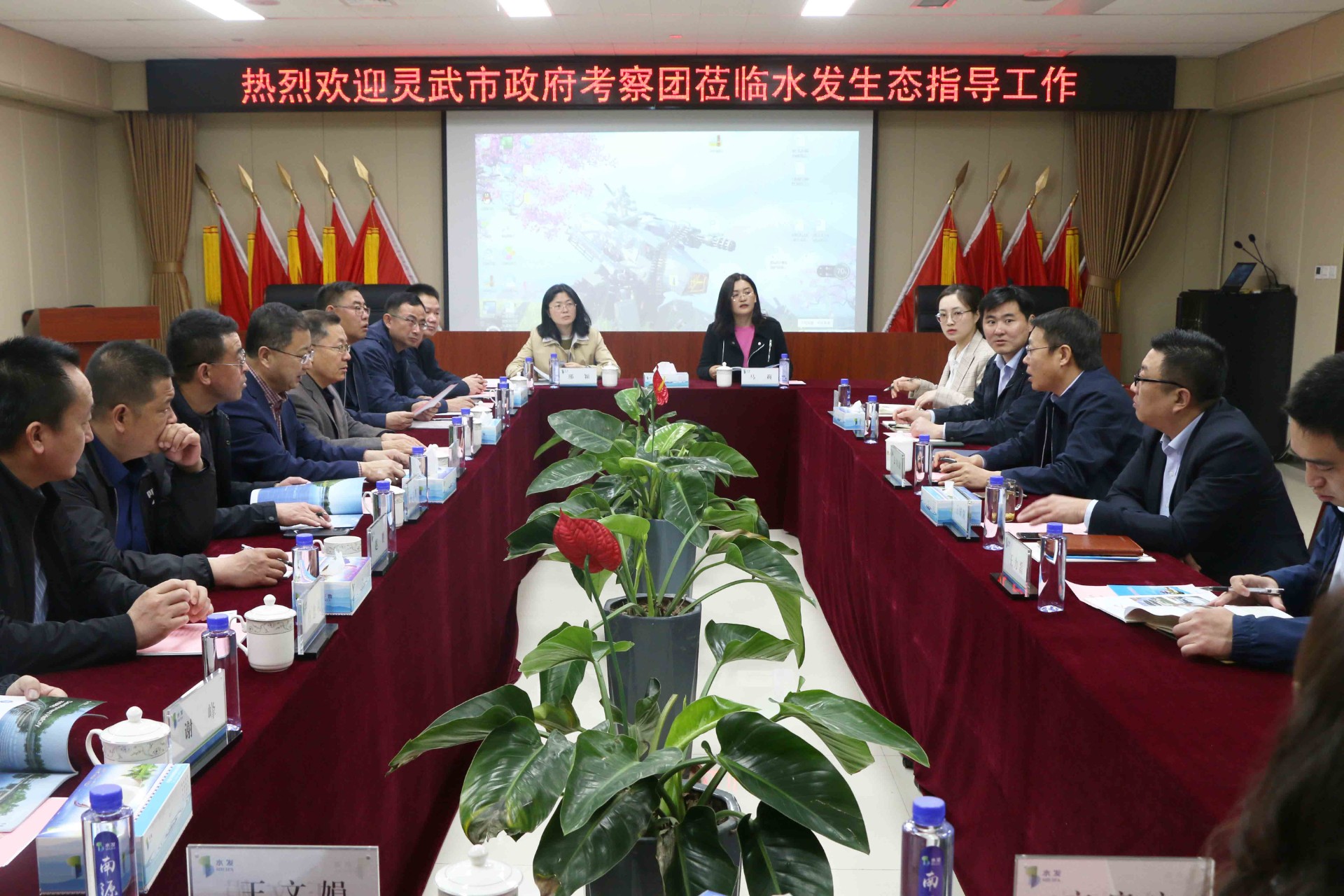 灵武市副市长杨国龙、政协办主任杨宇晖,水发生态产业集团有限公司常务副总经理王国防、副总经理谷世周等参加座谈。(王兆鑫 供稿)