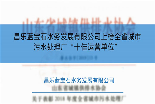 山东省城镇供排水协会日前公布了年度全省城市污水处理厂“十佳运营单位”的表彰决定,专家组共评出73家污水处理厂为年度全省城市污水处理厂“十佳运营单位”,其中,昌乐蓝宝石水务发展有限公司榜上有名。